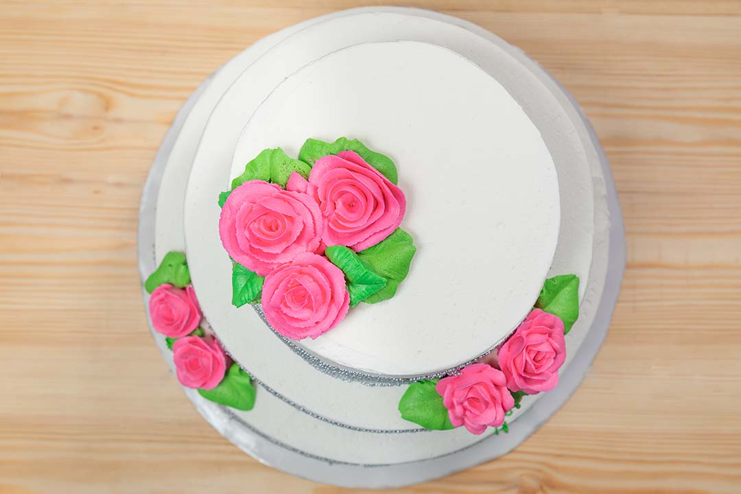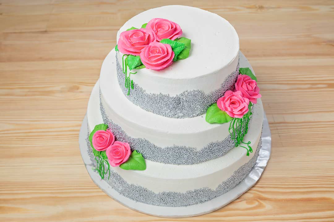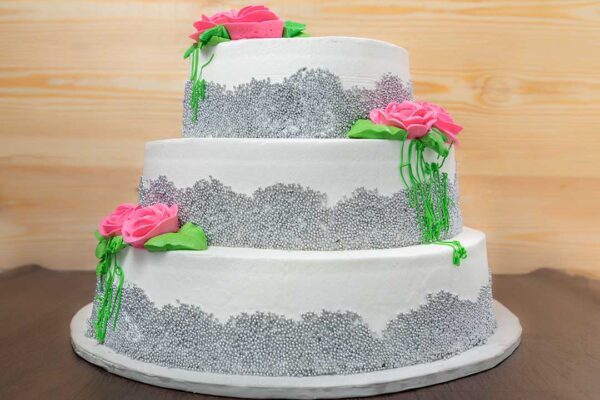 A large elegant wedding cake from Classic Foods, Trichy with same day delivery fit for a classic wedding theme. This is a three-tier retro Vanilla flavour butter cream wedding cake, Decorated with an uneven spread of edible silver balls along the end of each tier, garnished with large red roses.